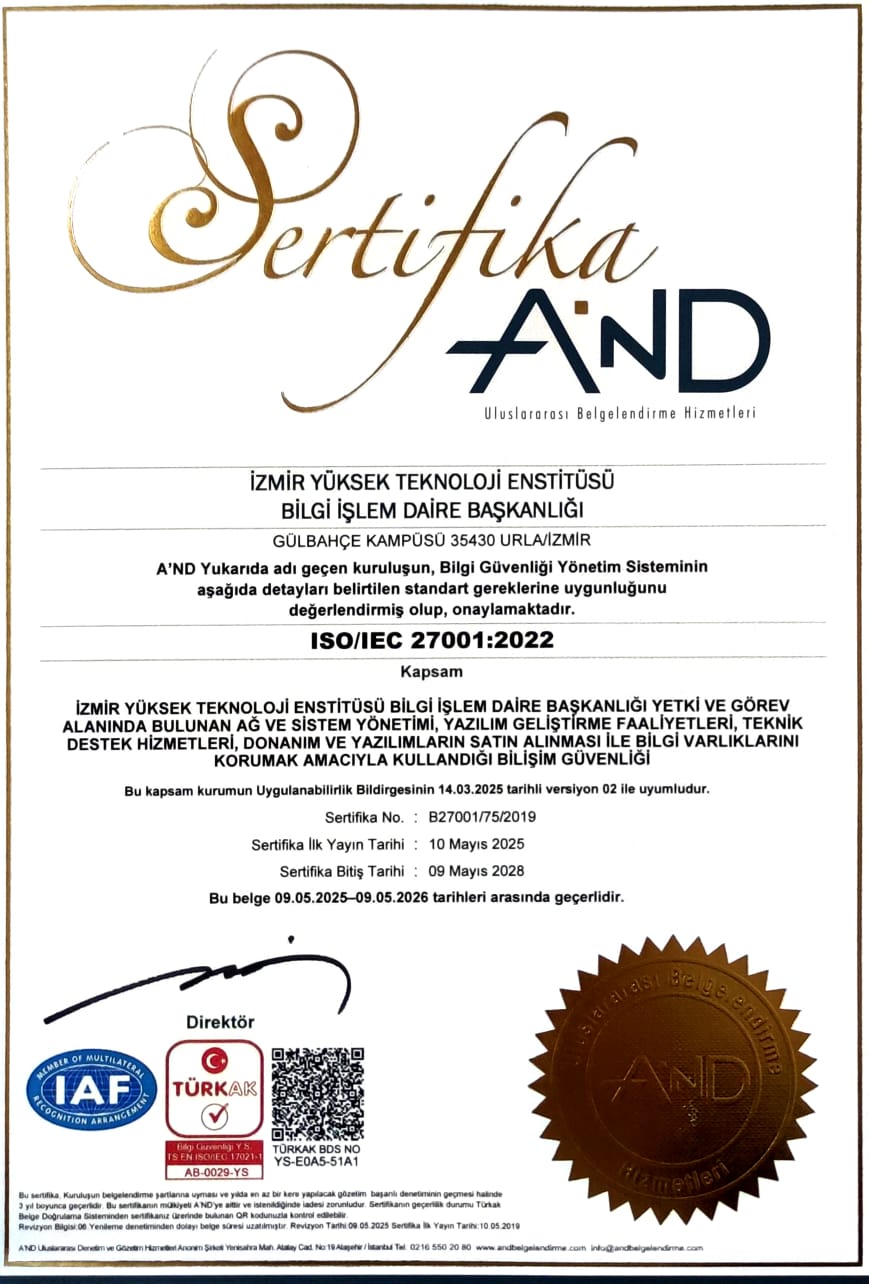 ISO27001 Sertifikamız İzmir Yüksek Teknoloji Enstitüsü – Bilgi İşlem Daire Başkanlığı “Bilgi Güvenliği Yönetim Sistemi” 2023 yılı denetimi sonucunda ISO/IEC 27001:2013 Bilgi Güvenliği Yönetim Sistemi belgesinin yenisini almaya hak kazanmıştır.